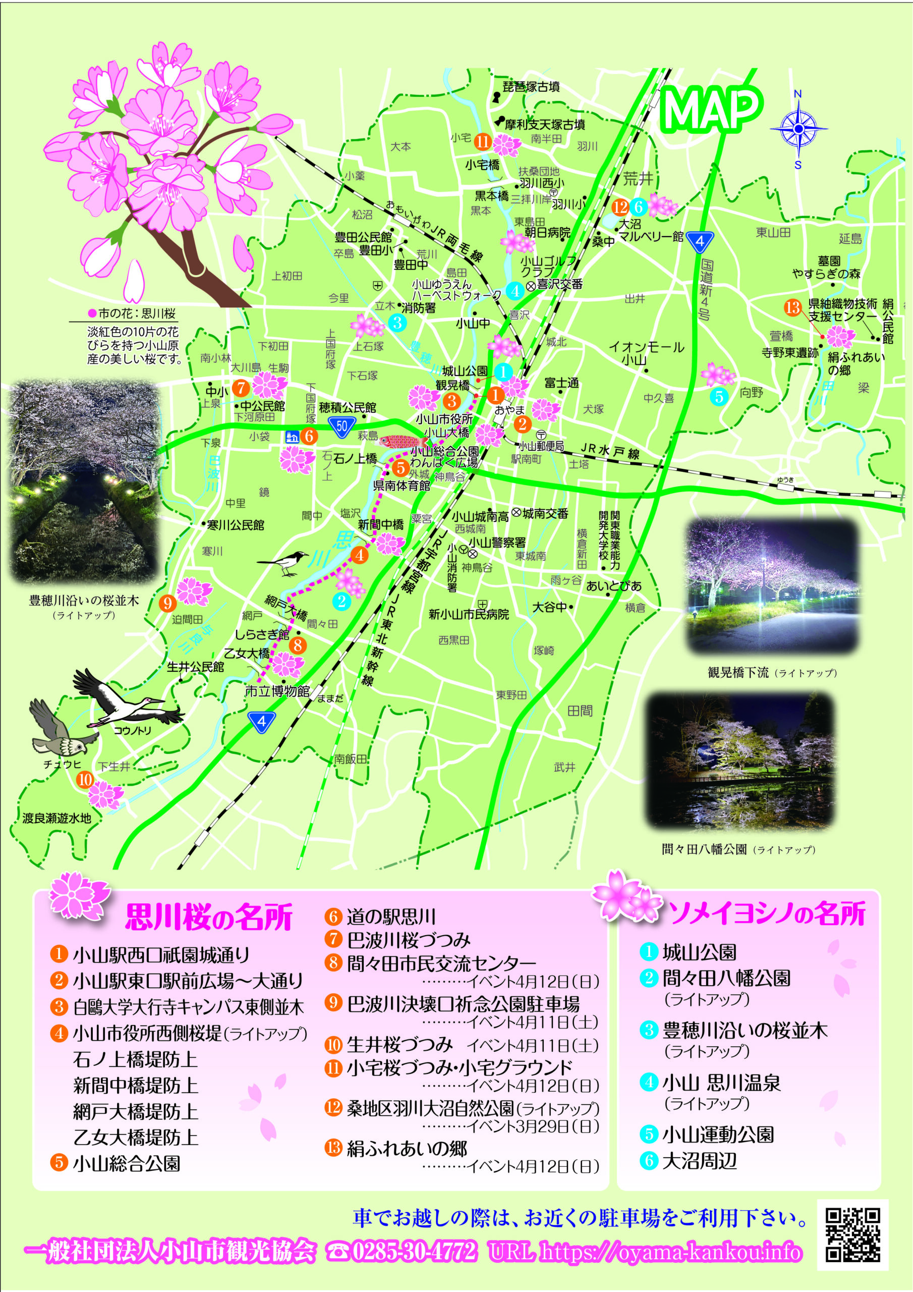小山の桜は、例年3月下旬頃からソメイヨシノ、4月上旬頃からは市の花、思川桜が開花します。